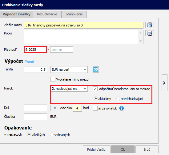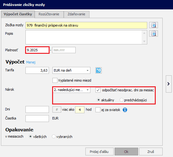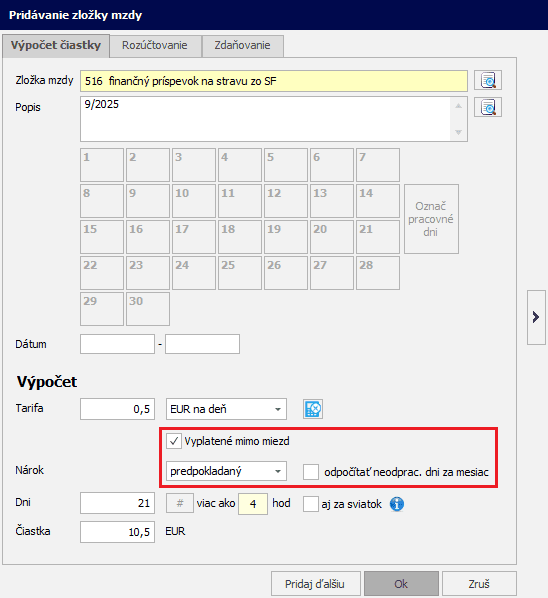 Finančný príspevok poskytnutý na mesiac september 2025 pridáte do mzdy ďalšou zložku mzdy 979 – finančný príspevok na stravu, do tarify uvediete 3,63 eura na deň a následne označíte voľbu Vyplatené mimo miezd. V časti nárok zvolíte voľbu predpokladaný, ale voľbu odpočítať neodpracované dni za mesiac neoznačíte.