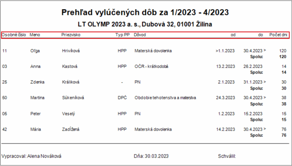 Od verzie 23.30 nájdete v Olympe nový dokument Prehľad vylúčených dôb (Tlač – Tlač – Evidencia nemocí). Je dostupný v zostavách Biznis/Profi/Profesionál.