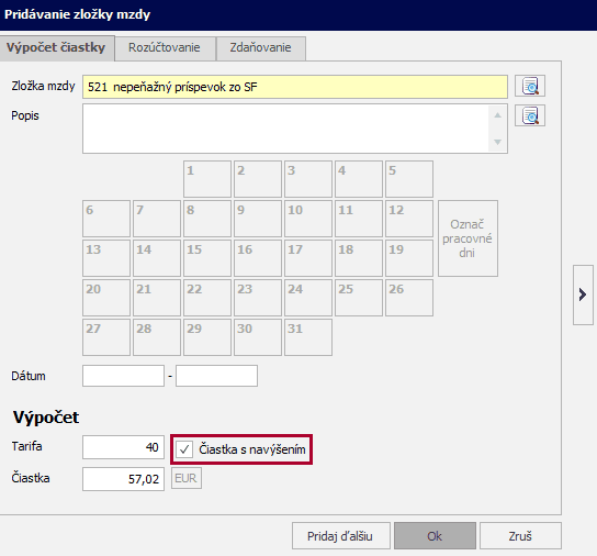 Zamestnávateľ sa môže rozhodnúť, že bude z nepeňažného príspevku poskytnutého zamestnancovi znášať odvody a daň. V tomto prípade je potrebné na zložke mzdy 521 – nepeňažný príspevok zo SF označiť voľbu Čiastka s navýšením.