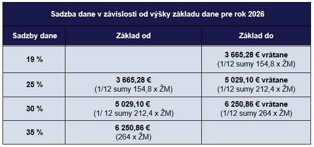 Od 1. januára 2026 sa zaviedli 4 pásma progresívneho zdanenia príjmov fyzických osôb. Na výpočet preddavkov na daň má vplyv výška základu dane zamestnanca.