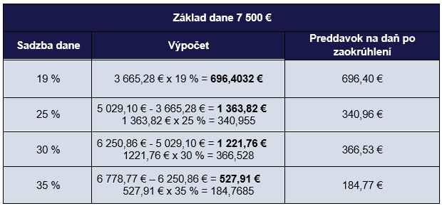Zvyšok základu dane zdaníme 35 % sadzbou dane = (6 778,77 € – 6 250,86 €) × 35 % = 527,91 € × 35 % = 184,7685 € = 184,77 €
