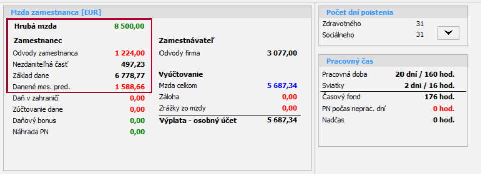 Základ dane = (Hrubá mzda – odvody) – NČZD = (8 500 € – 1 224 €) – 497,23 € = 6778,77 €
