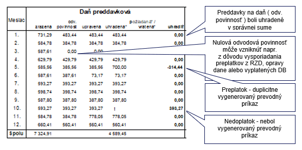 - uhradená – tento údaj je prevzatý z prevodných príkazov, druh účtu daň. úrad – preddavok. Ak sa v niektorom riadku nachádza ! (výkričník), znamená to, že v danom mesiaci nebol vygenerovaný prevodný príkaz na úhradu preddavkov na daň,