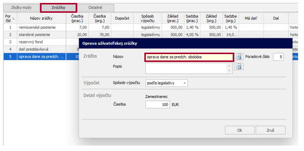 - celková – sumy zo zrážok oprava dane za predch. obdobia z vygenerovaných výplat (plusom nedoplatok, mínusom preplatok),