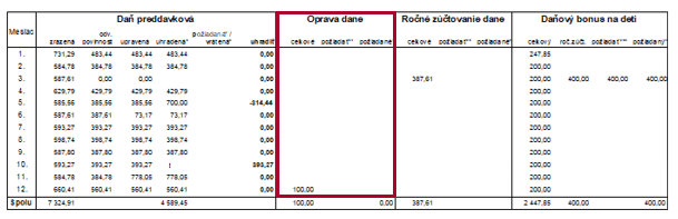 Sumy zo zrážok oprava dane za predch. obdobia sa uvádzajú v dokumente Rekapitulácia uhradenej dane v samostatnej časti Oprava dane so stĺpcami: