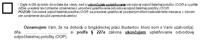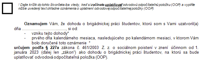 V oznámení dohodár ručne označí štvorček krížikom, ak si začína uplatňovať OOP. Po doplnení dátumu uzatvorenia dohody, ku ktorej sa oznámenie viaže, dohodár prečiarkne nehodiace sa.