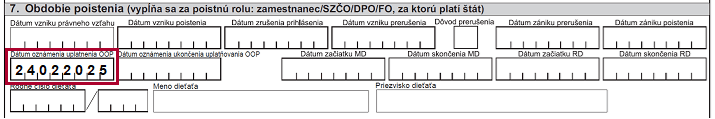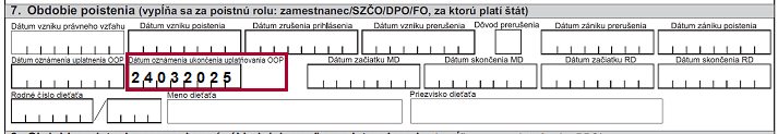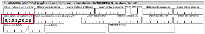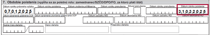 Dátum zániku poistenia sa uvedie v RLFO odhláška s kódom 7. Ukončenie uplatňovania OOP sa v odhláške neuvádza.