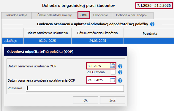 Ak je dátum oznámenia uplatnenia OOP zhodný s dátumom vzniku dohody alebo je skorší, dátum sa uvedie v RLFO prihláška. Voľbu RLFO zmena by zamestnávateľ označil v prípade, ak by zaslal do Sociálnej poisťovne prihlášku skôr, ako dohodár oznámi uplatňovanie OOP od vzniku dohody. Po zaevidovaní dátumu oznámenia ukončenia uplatňovania OOP, program vytvorí RLFO zmena k zadanému dátumu. OOP sa v tomto prípade uplatňuje počas celého trvania dohody, t. j. v mesiacoch január až marec 2025.