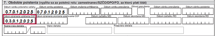 Dátum oznámenia ukončenia uplatňovania OOP sa uvedie v RLFO zmena s kódom 7.