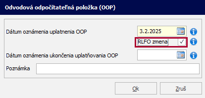 Dátum oznámenia uplatnenia OOP sa uvedie v RLFO zmena s kódom 3.