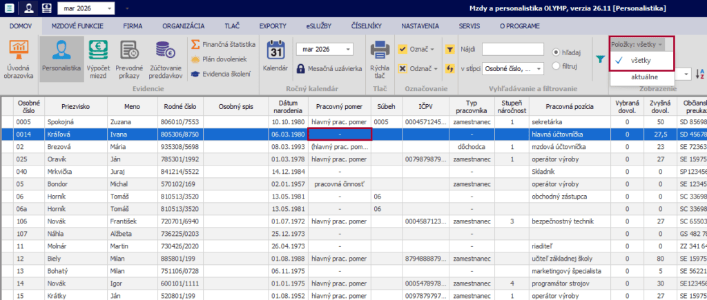 V evidencii Výpočet miezd na paneli nástrojov vyberiete voľbu Položky: všetky. Zobrazia sa všetci zamestnanci, vrátane tých, ktorým v danom mesiaci pracovný pomer netrvá.