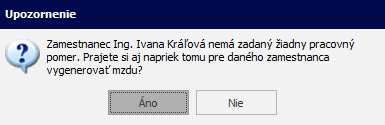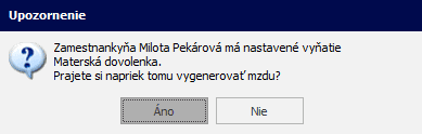 Aj napriek čiernemu krížiku zamestnankyni vygenerujete mzdu s označenou voľbou Pridať zúčtovanie preddavku na daň, zúčtovanie daňového bonusu a zamestnaneckú prémiu (ak existuje). Zobrazí sa uvedená hláška, ktorú potvrdíte cez Áno.