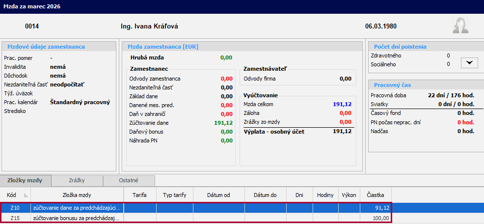 Po potvrdení hlášky program vygeneruje mzdu. Ak sa do výplaty preniesli zložky mzdy z Personalistiky (ak neboli pri ukončení pracovného pomeru ukončené), z výplaty ich vymažete. Ponecháte v nej iba zložky mzdy Z10 – zúčtovanie dane za predchádzajúci rok a Z15 – zúčtovanie bonusu za predchádzajúci rok, ktorými sa do mzdy prenesie výsledok z RZD. Preplatok zamestnancovi zašlete na účet, prípadne vyplatíte v hotovosti.