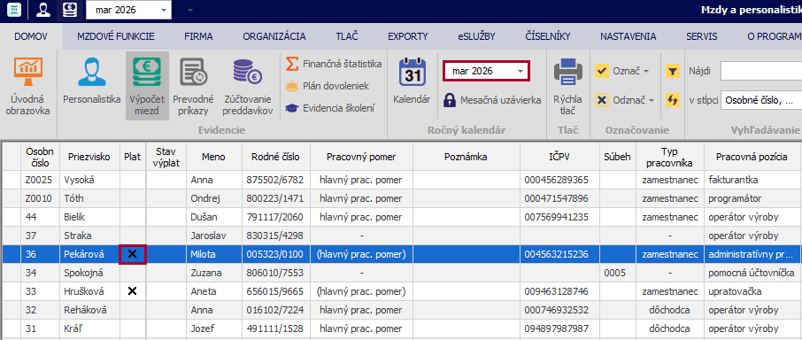 Keďže má zamestnankyňa evidované vyňatie z pracovného pomeru (Materská dovolenka), vo Výpočte miezd program automaticky nastaví v stĺpci Plat čierny krížik.
