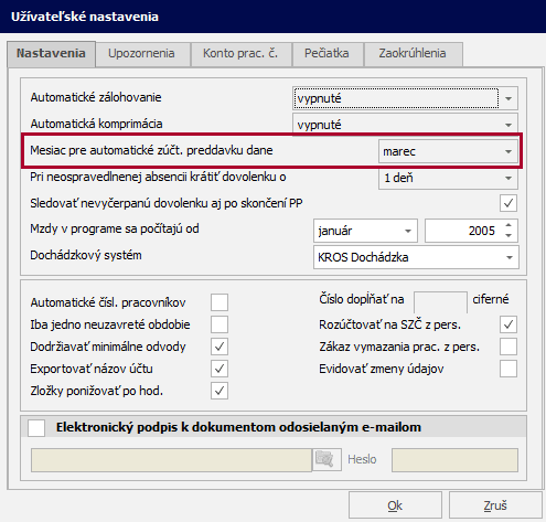 Cez menu Nastavenia – Nastavenia na karte Nastavenia si v poli Mesiac pre automatické zúčt. preddavku dane zvolíte mesiac, v ktorom má program preniesť všetky výsledky vygenerovaných ročných zúčtovaní dane do výplat zamestnancov.