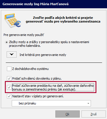 Počas generovania výplat označíte voľbu Pridať zúčtovanie preddavku na daň, zúčtovanie daňového bonusu a zamestnaneckú prémiu (ak existuje).