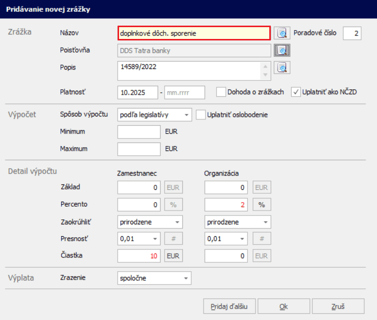 V poliach Minimum a Maximum môžete stanoviť, do akej výšky bude uvedená zrážka stiahnutá. V detaile výpočtu uvediete, akým spôsobom sa bude príspevok zamestnanca a zamestnávateľa zrážať. Môžete zvoliť konkrétnu čiastku alebo percento a to samostatne za zamestnanca a za zamestnávateľa.