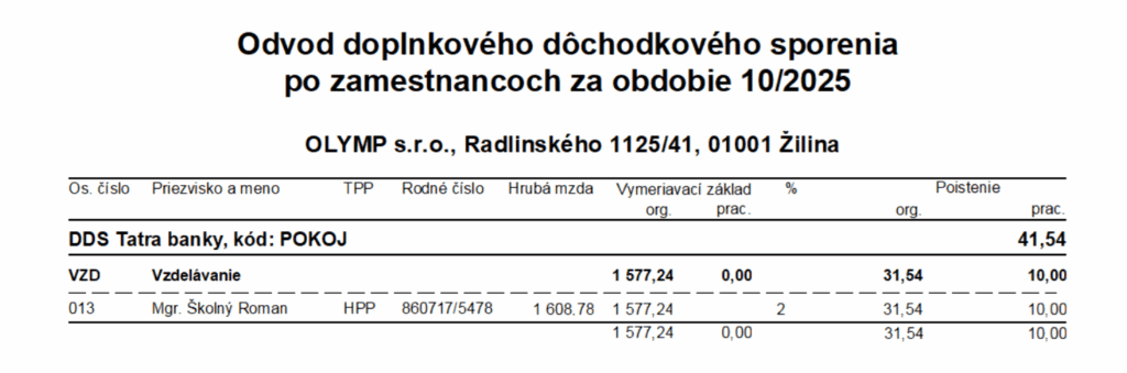 Prehľad mesačnej výšky odvodov na DDS v členení na organizáciu a zamestnancov vytlačíte cez menu Tlač – Tlač – Odvody poistného – Prehľad odvodov mesačný – Podľa odvodov DDS, PEPP, ÚS, ŽP.