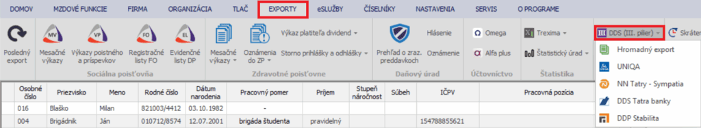 Export vo formáte xml vytvoríte cez Exporty – DDS (III. pilier), kde máte možnosť zvoliť si hromadný export, prípadne konkrétnu spoločnosť, pre ktorú chcete rozpis príspevkov exportovať.
