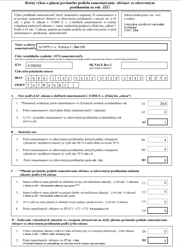 Po zobrazení dokumentu na obrazovku je možné jednotlivé polia upravovať nakoľko dokument je editovateľný. Olymp automaticky doplní názov úradu práce a údaje o zamestnávateľovi, vrátane bankového spojenia. Na základe evidovaných údajov vyplní údaje v časti A – Stav podľa § 63 zákona o službách zamestnanosti č. 5/2004 Z. z. a B – Skutočný stav). Nakoľko v časti C a D sa vypĺňajú údaje o sumách zákaziek , ktoré nie je možné dotiahnuť z programu OLYMP, je potrebné údaje zadať ručne. Program následné dopočíta v riadku C4 a D2 počet započítaných osôb podľa výšky plnenia.