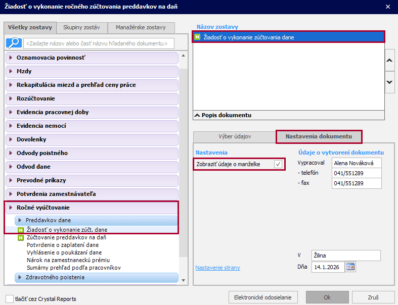 Od verzie 26.00 sme aktualizovali dokument Žiadosť o vykonanie zúčtovania dane (Tlač – Tlač – Ročné vyúčtovanie – Preddavkov dane). Zamestnanec môže elektronicky alebo v listinnej podobe požiadať zamestnávateľa o vykonanie ročného zúčtovania dane za rok 2025 do 16. februára 2026.
