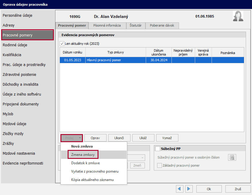 Ak sa od vzniku pracovného pomeru menia u zamestnanca dohodnuté údaje oproti pôvodnej pracovnej zmluve, pridáte zamestnancovi Zmenu pracovnej zmluvy.