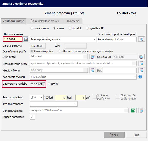 Ak by sa pracovný pomer uzatvorený na dobu určitú predlžoval opätovne na určitú dobu, v zmene pracovnej zmluvy označíte voľbu Uzatvorenie na dobu určitú a doplníte nový dátum.