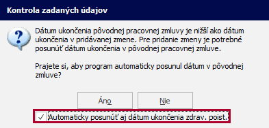 Pri predĺžení pracovnej zmluvy opäť na dobu určitú program po potvrdení tlačidla Áno posunie dátum ukončenia v pôvodnej pracovnej zmluve na nový dátum ukončenia podľa pridanej zmeny pracovnej zmluvy. Ak ste mali zadaný aj dátum ukončenia zdravotného poistenia a označíte voľbu „Automaticky posunúť aj dátum ukončenia zdrav. poist.“, program pridá nový dátum ukončenia na karte Zdravotné poistenie.