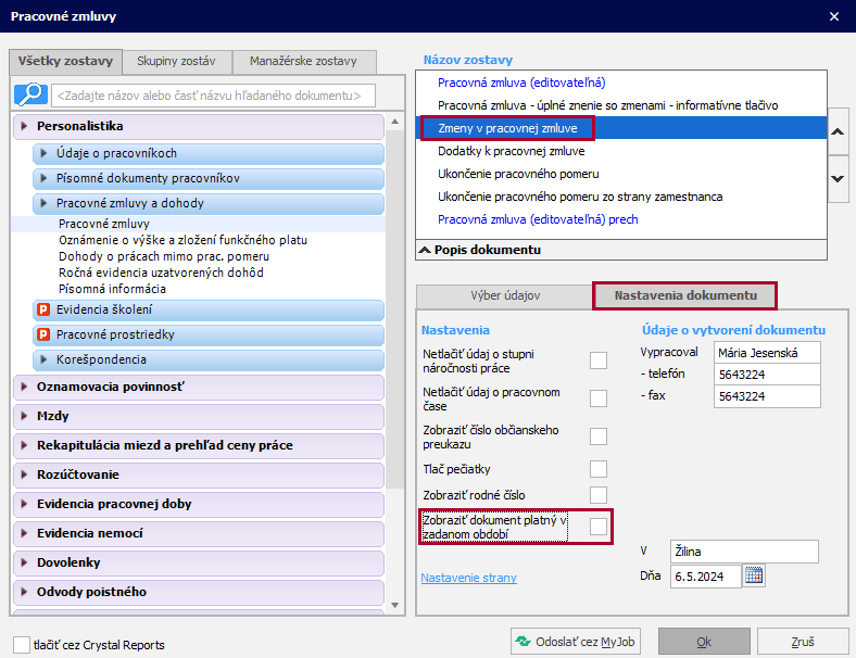 Každú Zmenu pracovnej zmluvy si môžete vytlačiť cez menu Tlač – Tlač – Personalistika – Pracovné zmluvy a dohody – Pracovné zmluvy – Zmeny v pracovnej zmluve.