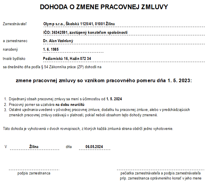 Zamestnanec pracuje v organizácii na Hlavný pracovný pomer. Pracovnú zmluvu má uzatvorenú na dobu určitú do 30. 4. 2024. Zamestnávateľ a zamestnanec sa dohodli na predĺžení pracovného pomeru na dobu neurčitú.