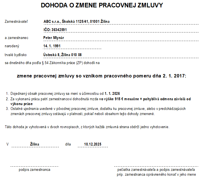 Zmenu pracovnej zmluvy vytlačíte cez Tlač – Tlač – Personalistika – Pracovné zmluvy a dohody – Pracovné zmluvy – Zmeny v pracovnej zmluve.