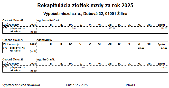 V dokumente Rekapitulácia zložiek mzdy ročne po zamestnancoch (Tlač – Tlač – Rekapitulácia miezd a prehľad ceny práce – Rekapitulácia zložiek mzdy – Ročne po zamestnancoch) získate prehľad po zamestnancoch a mesiacoch, v ktorých bol príspevok na rekreáciu v roku 2025 zúčtovaný v mzdách.