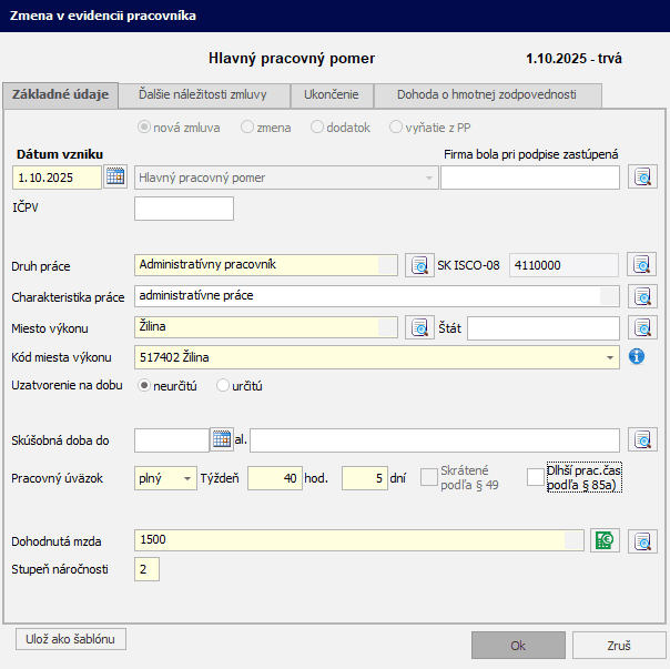 Po vyplnení údajov o pracovnom vzťahu personalistom alebo mzdárom v dotazníku, ich môže uložiť a schváliť. Schválený dotazník sa naimportuje priamo do programu Mzdy a personalistika OLYMP. Importom sa okrem údajov o novom zamestnancovi prenesú aj údaje o pracovnom vzťahu do Personalistiky na kartu Pracovné pomery na záložku Pracovný pomer.