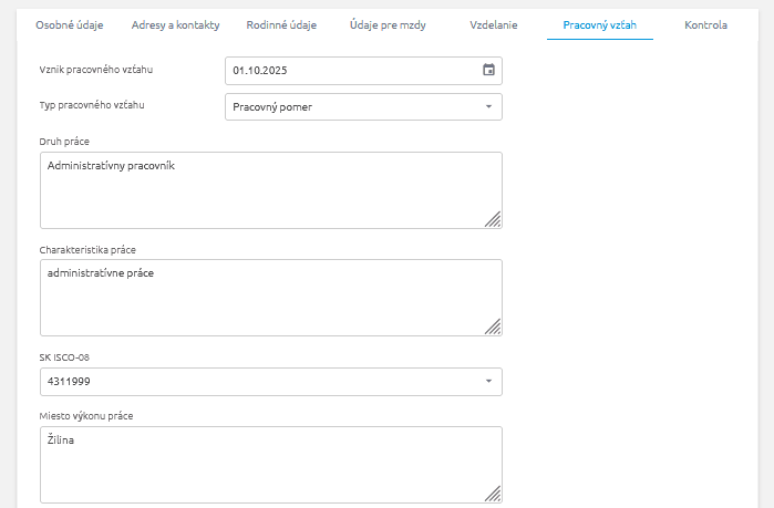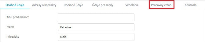 Zamestnanec pri vypĺňaní osobného dotazníka záložku o pracovnom vzťahu nevidí. Záložka Pracovný vzťah sa zobrazí až v aplikácii personalistovi alebo mzdárovi v prijatom dotazníku od zamestnanca, kde v nej vyplní údaje o pracovnom vzťahu ešte pred jeho samotným schválením.