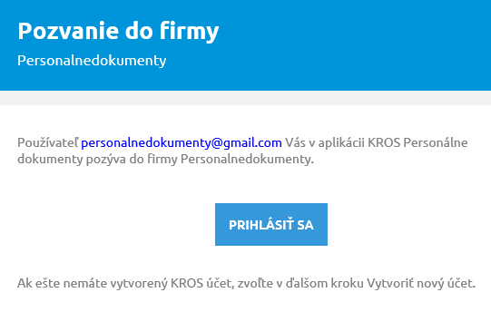 Po prihlásení môže nový používateľ (ďalší mzdár alebo personalista) pracovať v KROS Personálnych dokumentoch. Ak nový používateľ ešte nemá registrovaný svoj e-mail v KROS účte, musí si ho najskôr zaregistrovať. Po vytvorení mu príde aktivačný e-mail a po aktivácii už môže pracovať v KROS Personálnych dokumentoch.