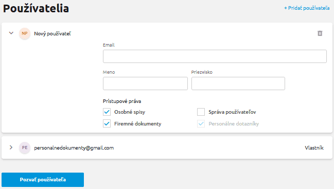 V časti Nový používateľ zadáte jeho Email, Meno, Priezvisko a zakliknete v Prístupových právach na ktorú sekciu bude mať nový používateľ vytvorený prístup. Následne kliknete na tlačidlo Pozvať používateľa.