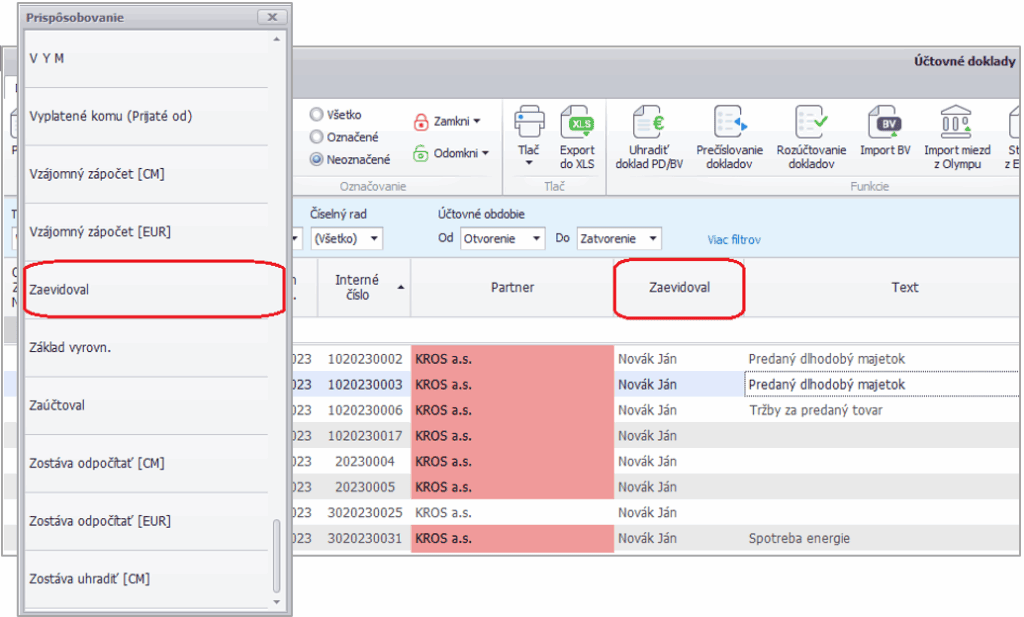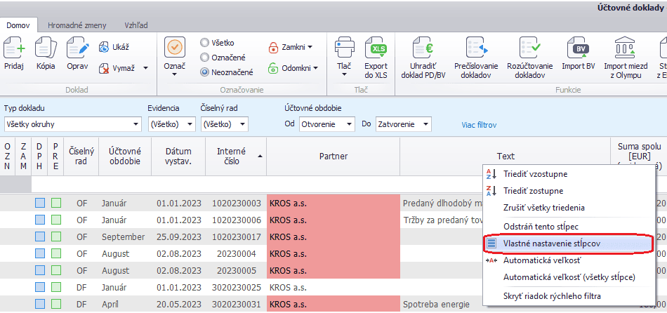 Chcete si do nového vzhľadu pridať stĺpce, ktoré používate najčastejšie? Stačí kliknúť pravým tlačidlom myši na hlavičku v Evidencii účtovných dokladov, prípadne Fakturácii a vybrať voľbu Vlastné nastavenie stĺpcov.