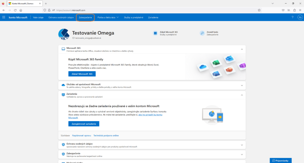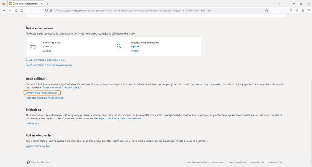 Ak chcete v OMEGE nastaviť odosielanie e-mailov cez 365 mail a máte nastavené 2 stupňové overovanie, je potrebné v účte Microsoft vygenerovať heslo aplikácie nasledujúcimi krokmi: