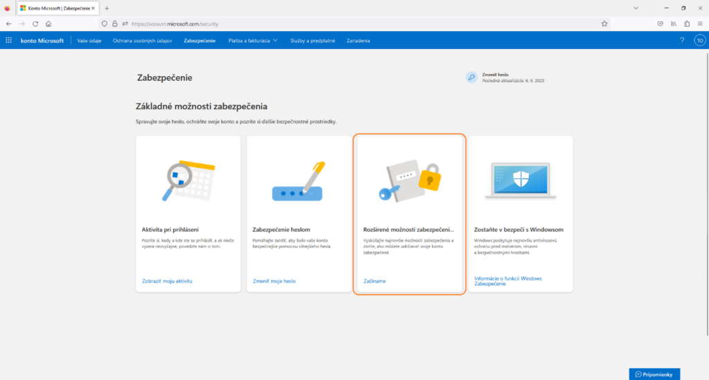 - Otvorte stránku https://account.microsoft.com/ a v sekcii Zabezpečenie prejdite na Rozšírené možnosti zabezpečenia.