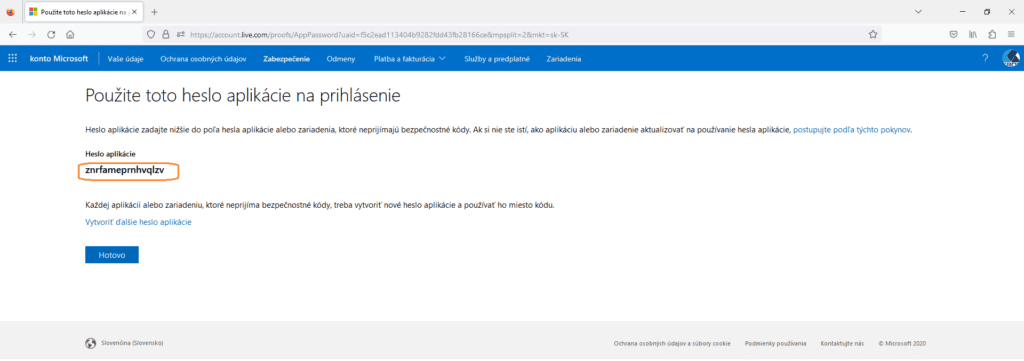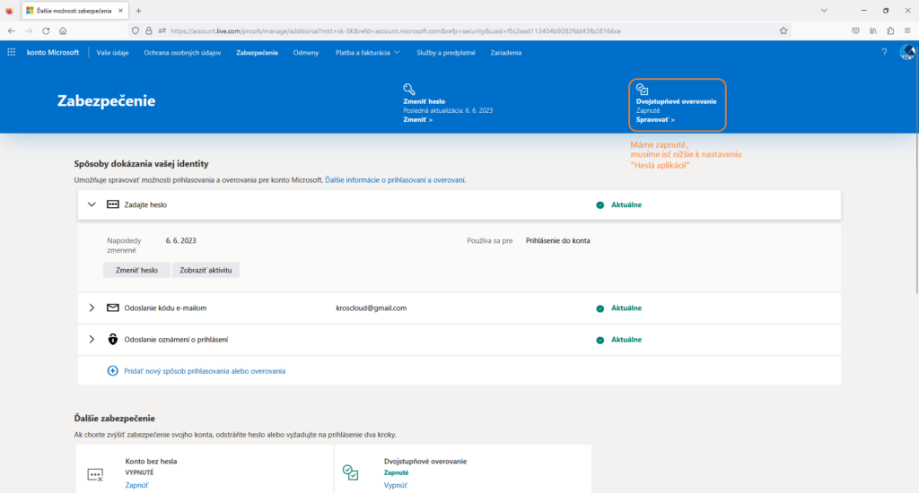 Ak toto Dvojstupňové overovanie zapnuté nemáme, tak použijeme rovnaké heslo pre nastavenie SMTP ako pri prihlasovaní do konta Microsoft.