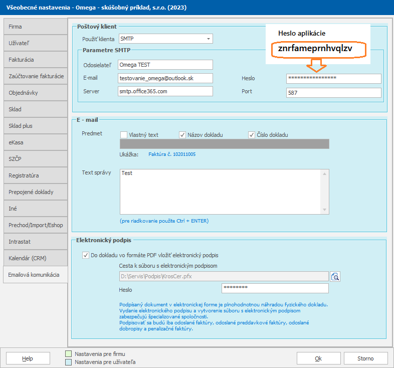 - Vygenerované heslo si skopírujeme. Následne ho zadáme do programu OMEGA cez menu Firma – Nastavenie – Všeobecné nastavenia do záložky Emailová komunikácia – Parametre SMTP.