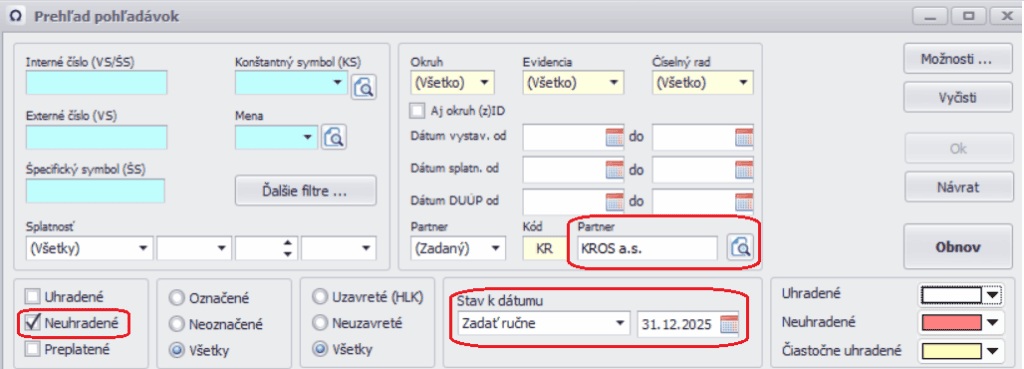 Cez menu Prehľady – Prehľad pohľadávok si vyfiltrujeme neuhradené doklady pre konkrétneho partnera (prípadne pre všetkých partnerov) a cez políčko Stav k dátumu vyberieme dátum, ku ktorému budeme pohľadávky odsúhlasovať.