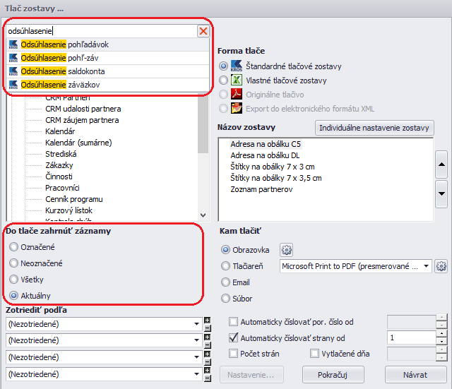 Po vybratí zostavy je potrebné správne zvoliť kritérium „Do tlače zahrnúť záznamy“: