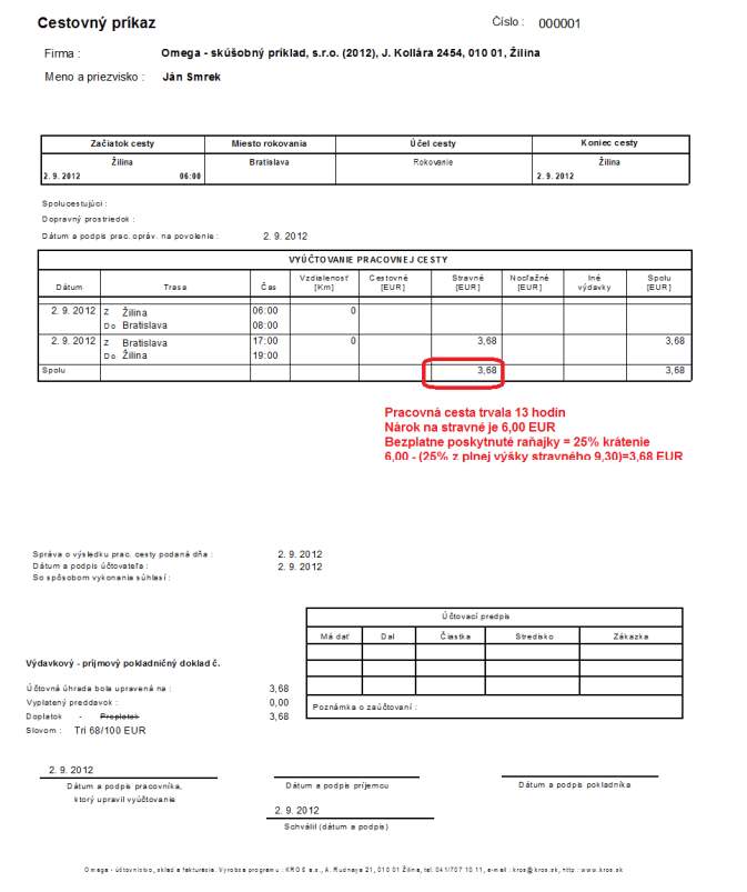 Služobná cesta trvala 13 hodín, zamestnancovi vznikol nárok na stravné vo výške 6,00 EUR. Boli mu však bezplatne zabezpečené raňajky, preto mu budeme stravné krátiť o 2,325 EUR (hodnota krátenia sa odpočítava od stravného nezaokrúhlená, následne sa suma stravného, v prípade potreby, zaokrúhli na najbližší eurocent nahor). Nárok na stravné je vypočítaný nasledovne: 6,00 – 2,325 = 3,68 EUR. Krátenie je možné zadať v tuzemských aj zahraničných cestovných príkazoch.