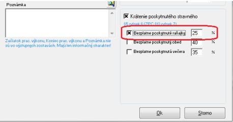 - Ak má zamestnanec poskytnuté stravovanie na služobnej ceste čiastočne, zapneme príslušnú voľbu pre bezplatne poskytnuté raňajky, obed alebo večeru. Krátenie sa vykoná z maximálnej výšky stravného. Napríklad hodnota krátenia v tuzemsku za bezplatne poskytnuté raňajky sa vypočíta: 0,25 x 9,30 EUR = 2,325 EUR. Vypočítaná hodnota krátenia sa odpočíta od výšky stravného, na ktorý vznikol zamestnancovi nárok.
