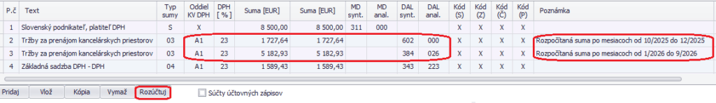 V bežnom období zaúčtujeme odoslanú faktúru, kde základ dane rozčleníme podľa počtu mesiacov prenájmu na výnos bežného obdobia (napr. na účet 602) a výnos budúceho obdobia (účet 384). V Evidencii účtovných dokladov využijeme funkciu Rozúčtuj – Náklady/Výnosy na budúce obdobie, kedy program automaticky rozpočíta základ dane a doplní do poznámky informáciu, o aké obdobie ide.