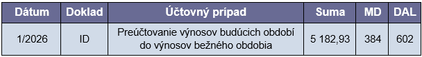 V nasledujúcom období sumu výnosov budúcich období preúčtujeme na príslušný výnosový účet pomocou interného dokladu. Opäť môžeme na rozúčtovanie využiť automatickú funkciu.