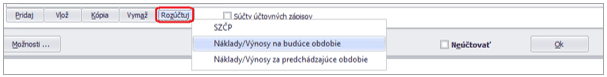 Po vybratí voľby Rozúčtuj sa zobrazí formulár „Rozúčtovanie na budúce obdobia„, kde sú na výber možnosti: