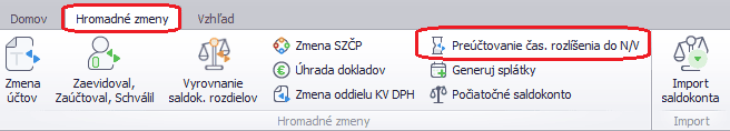 Na zjednodušené preúčtovanie zostatkov na účtoch časového rozlíšenia z minulého roka do nákladov (prípadne výnosov) je možné využiť funkciu Preúčtovanie účtov časového rozlíšenia do N/V. Túto funkciu spustíme cez menu Evidencia – Účtovné doklady v záložke Hromadné zmeny.