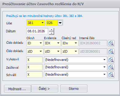 - v poli Účet vyberieme z rozbaľovacieho zoznamu syntetický účet 381, 382 alebo 384, na ktorom sme v minulom roku účtovali (aj s príslušným analytickým účtom),